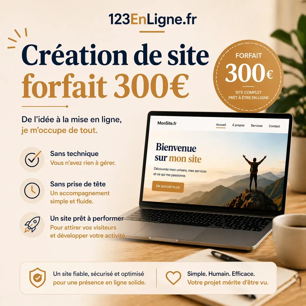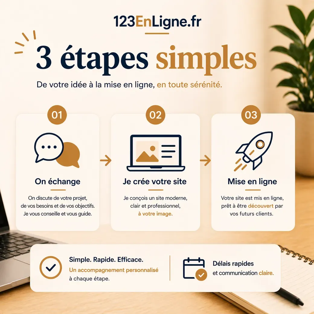 Pour un tarif forfaitaire de 300€, tout est pris en charge jusqu’à la mise en ligne : un site clair, avec votre propre nom de domaine, prêt à valoriser votre activité et à inspirer confiance.