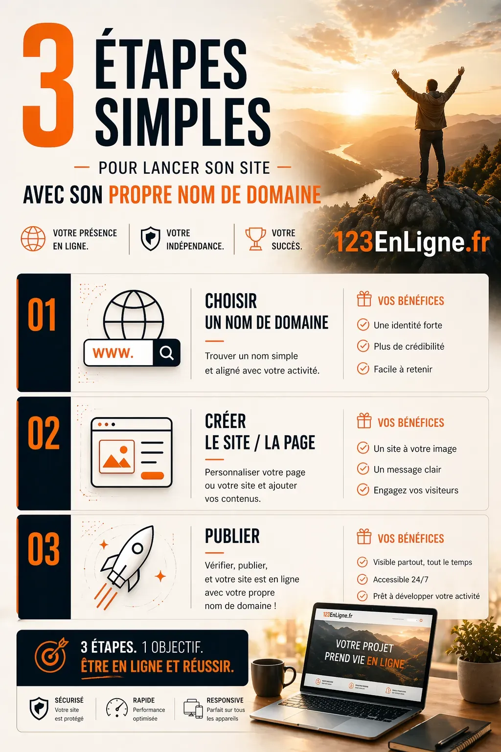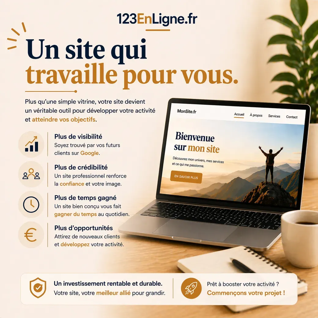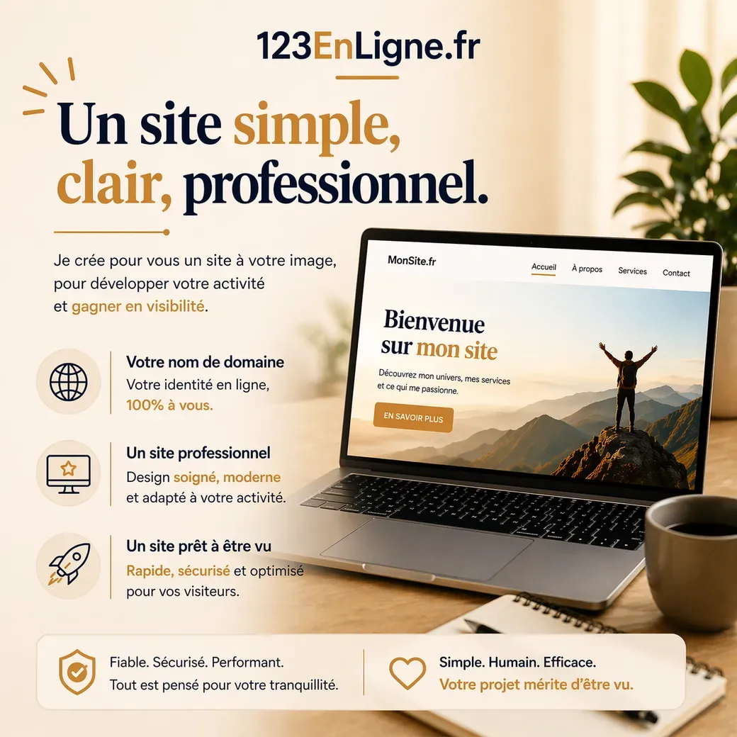 Une solution idéale pour présenter votre activité de manière claire et professionnelle. Vous bénéficiez d’un site sobre, efficace, avec votre propre nom de domaine, conçu pour inspirer confiance et rendre votre projet visible en ligne, sans complexité technique.